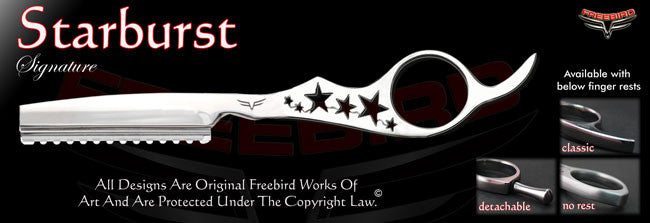 Freebird Shears is the only shear company in the world that lets you build your own professional custom razors from scratch in just a few easy steps. Our Custom razors are hand made one by one according to our customers specifications right here in the U.S.A. out of high quality stainless steel. No plastic parts whatsoever. All of our razors come with a lifetime and a money back guarantee. We stand behind our products 100%. Making flawless precision instruments that reflect who our customers are as professionals, as artists and as human beings is what we are all about.